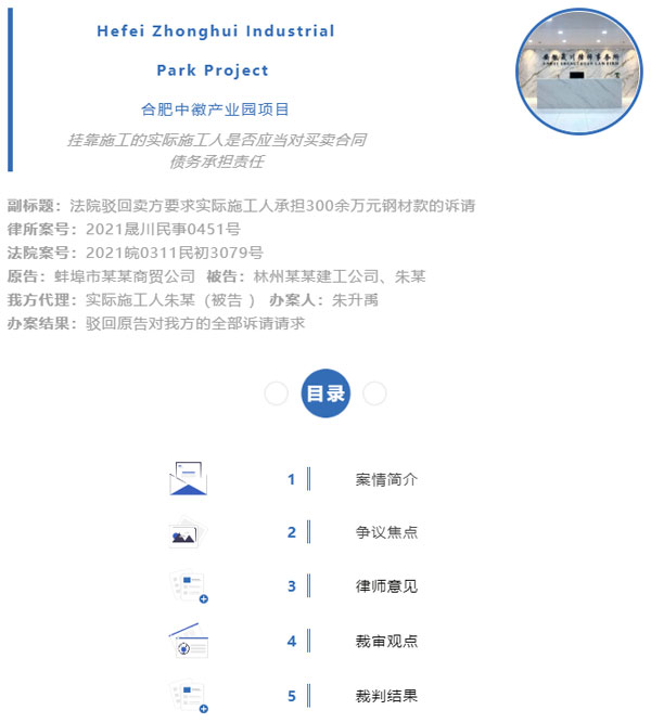 后因索要钢材款无果,卖方蚌埠市某商贸公司以买方林州某建工公司、王贵、朱某为被告提起诉讼,要求三被告共同支付货款1755586.61元以及加价款1325414.3元,共计3081000.91元。被告朱某遂找到本律师团队代理相应民事诉讼。通过一审、二审发回重审等各个阶段的充分准备,法院最终驳回的原告对于我方(实际施工人朱某)的诉请,并且大幅扣减了诉请的金额。